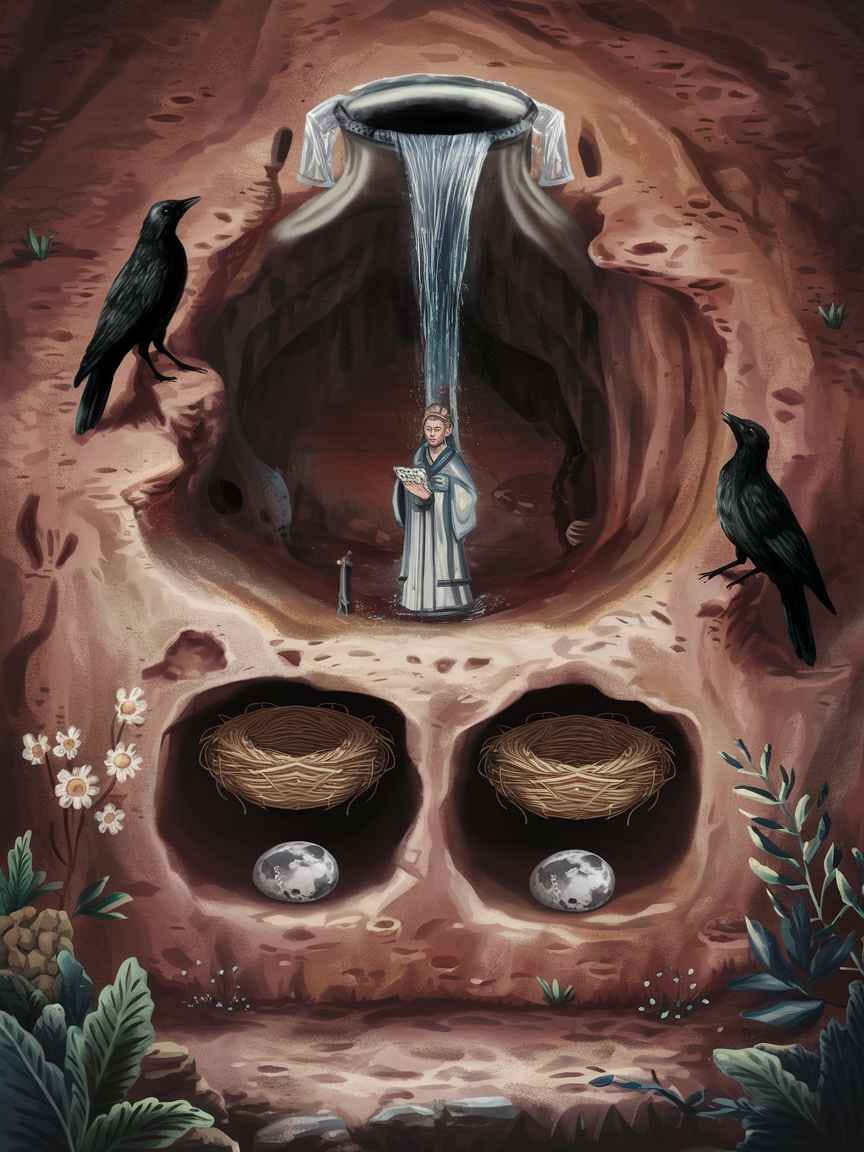 All the emblems are there—the two crows and the chanter deep in the cave—cleanly drawn and legible as a whole. Even interactions that defy common sense (the cave ending in a jar neck) are rendered clearly enough to memorize. Ideogram doesn’t read my mind, and this isn’t the exact scene I first imagined, but it is persuasive and perfectly usable as a visualization support.
